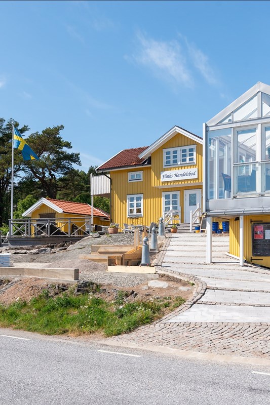Vill du njuta av en god middag på en mycket trevlig restaurang promenerar du ett par hundra meter ner till Handelsman Flink, ett populärt besöksmål i Evert Taubes fotspår. Titta in i Handelsboden och upplev historiens vingslag, köp en karamellstrut, souvenirer eller glass och fika i den genuina miljön. Kommer dina vänner med båt finns det möjlighet att lägga till vid gästbryggan alldeles nedanför. På ön bodde under 1940-talet trubaduren och diktaren Evert Taube, som skrev många av sina mest kända visor under denna period. Här diktade, inspirerades han och skrev visorna som gjort trakten berömd. Läs gärna mer under ”Omgivning”.