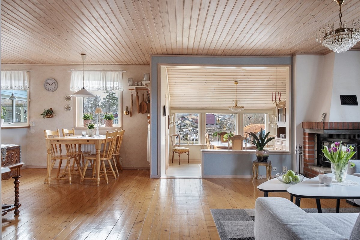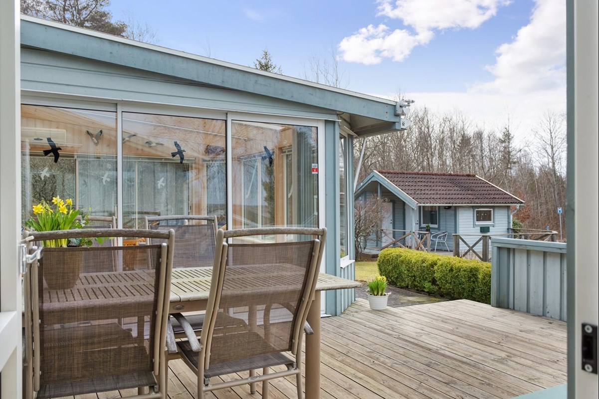 Huset bjuder på en smart och trivsam planlösning med hall, kök, vardagsrum, två sovrum, badrum, tvättstuga och WC samlat på ett och samma plan. För gäster eller tonåringar finns en rymlig gäststuga med egen toalett på tomten, vilket ger privat sfär för alla. Livskvaliteten maximeras med både inglasat uterum och altaner som bjuder in till socialt umgänge under sommarhalvåret.