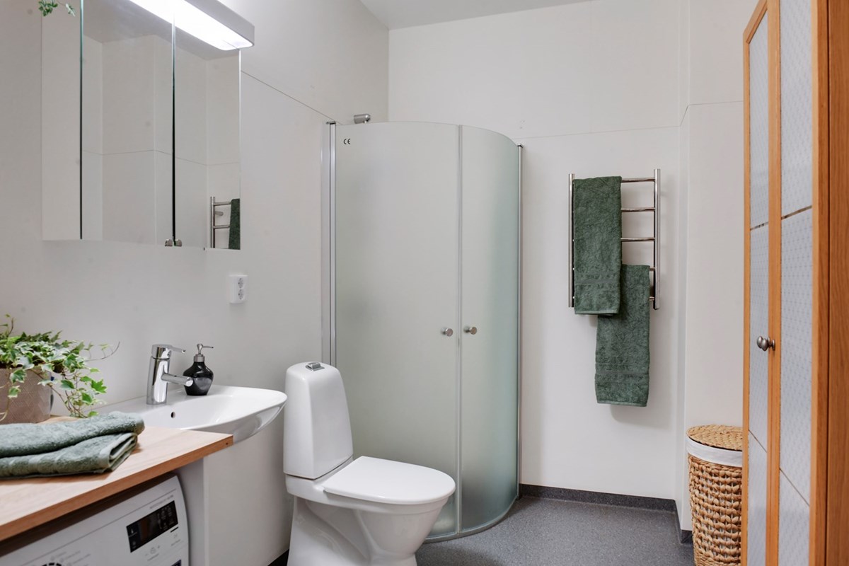 Badrummet är rymligt för att vara lägenhet. Här ryms WC, handfat, spegelskåp, högskåp, dusch med rundade infällbara glasdörrar, handdusktork samt tvättmaskin/torktumlare. I föreningen finns också en fin tvättstuga.