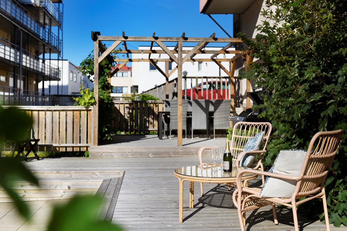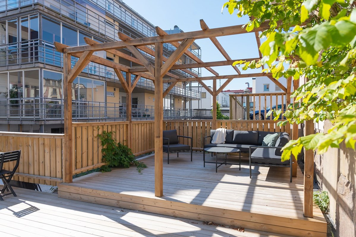 Föreningens uteplats kan beskrivas som en unik oas mitt i stan, något som inte många föreningar kan skryta med. Uteplatsen ligger i soligt läge, skyddad mot vind och så stor som den är går här att finna sol i princip från morgon till kväll. Den går i etage och flera utegrupper finns att välja emellan, alla placerade med gott avstånd emellan. Från din lägenhetsdörr är det bara en trappa upp till uteplatsen. Vill du bjuda vännerna på middag väljer du någon av matgrupperna, vill du fika finns förstås fikabord. För en slappdag hemma rekommenderas någon av loungegrupperna. Föreningen har också en nyligen färdigställd bastu.