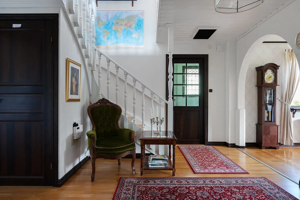 En vacker granittrappa leder oss mot de stiliga ekdörrarna och vi välkomnas in i en rymlig och praktisk hall.