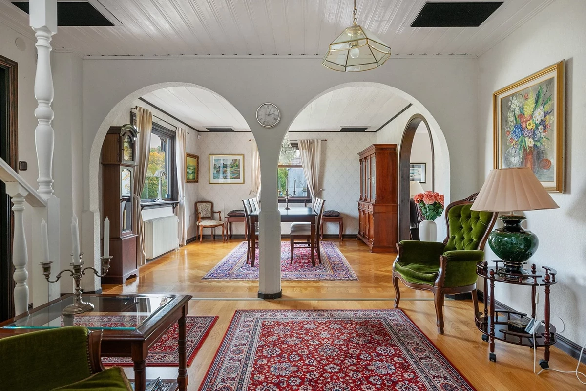 Huset inrymmer matsal med plats för de riktigt stora middagsbjudningarna. Här finner vi den ursprungliga mönsterlagda ekparketten på golvet, vilken senare löper vidare in i vardagsrummet. Här är ljust och luftigt tack vare ljusinsläpp från flera håll. Vardagsrummets andra del rymmer stor soffgrupp och även en TV-del om så önskas. Ljust med vitmålade väggar och ljusflöde från baksidans västerläge.