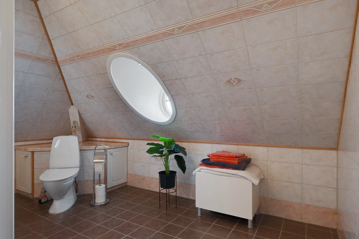 Övre plans badrum är inrett med duschkabin, bred kommod med handfat samt toalett. Badrummet erbjuder även handdukstork, bruntonat klinker med golvvärme som både torkar upp och värmer gott under fötterna.