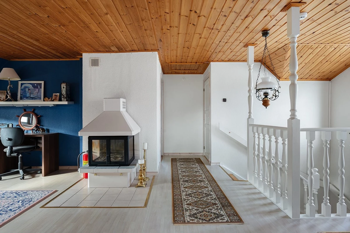 Från entréhallen leder en ektrappa med vitt snidat träräcke oss upp till husets övre plan. Här möts vi av ett stort allrum med ytterligare en öppen spis centralt placerad. Här finns också utgång till balkong. Här inreder man gärna ett sällskaps- eller TV-rum men det är också stort nog att delas av för att skapa fler rum om behov finns.