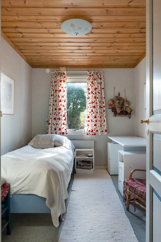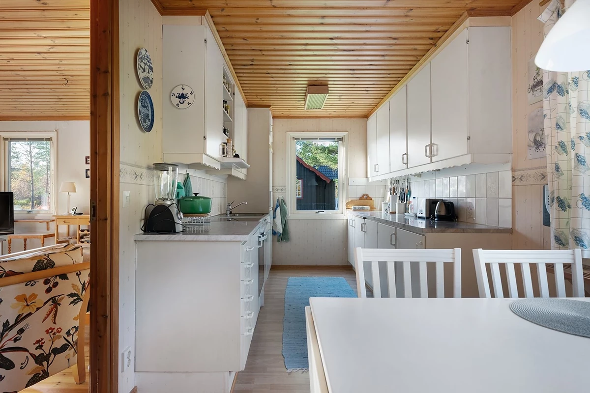 Köket är praktiskt planerat med bra förvaringsutrymmen och matplats, och badrummet är renoverat med modern standard. Här finns tre sovrum, och i gäststugan finns ytterligare sängplatser; perfekt för familj, vänner eller tonårsbarn som vill ha lite eget utrymme.