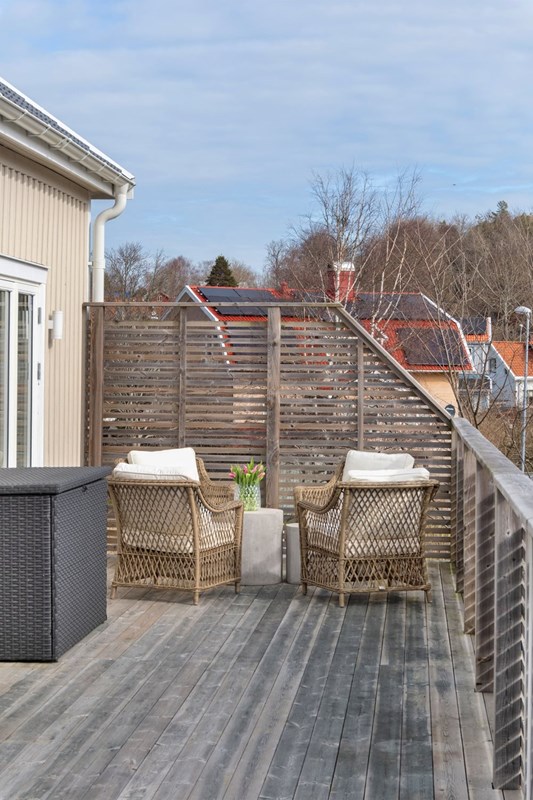 Utemiljön är en naturlig förlängning av huset. Här suddas gränsen mellan inne och ute ut på ett sätt som gör att hemmet känns större än sina kvadrat. Det finns flera platser att slå sig ner på beroende på tid på dagen och humör. Morgonkaffet i solen, eftermiddagar i lä och långa kvällar där ljuset dröjer sig kvar.
