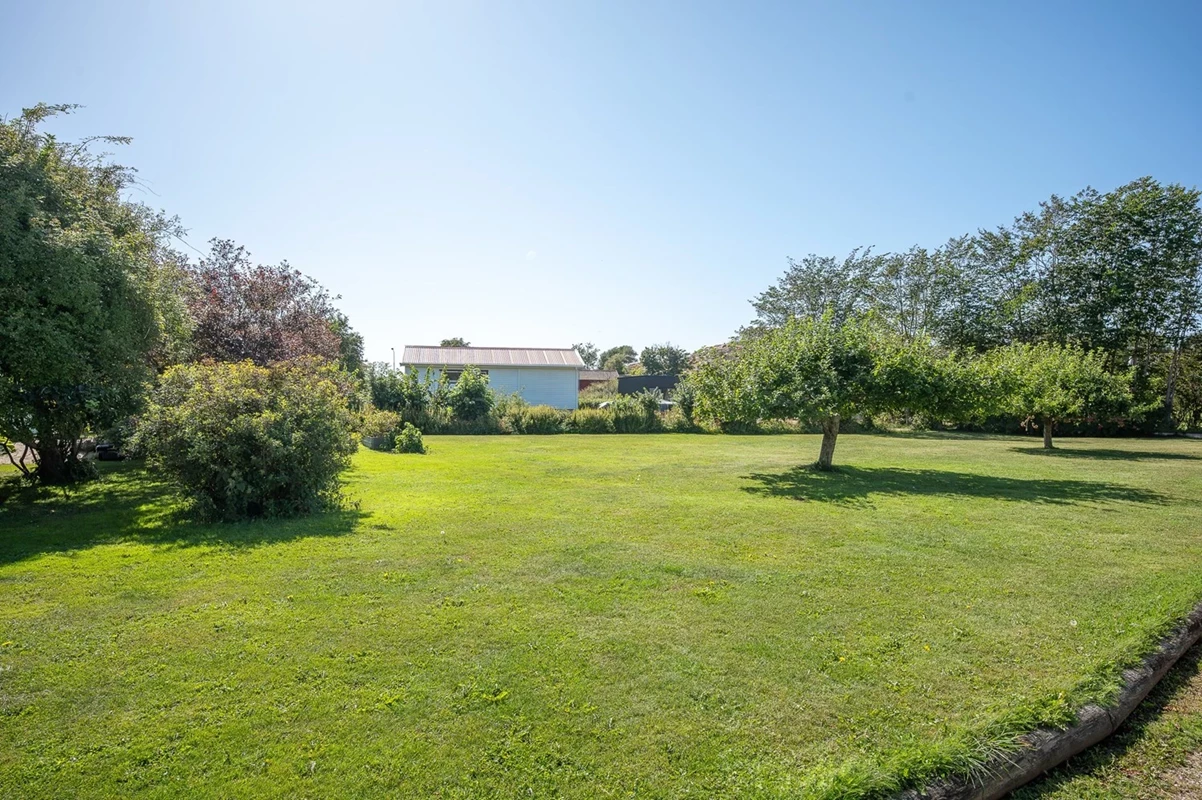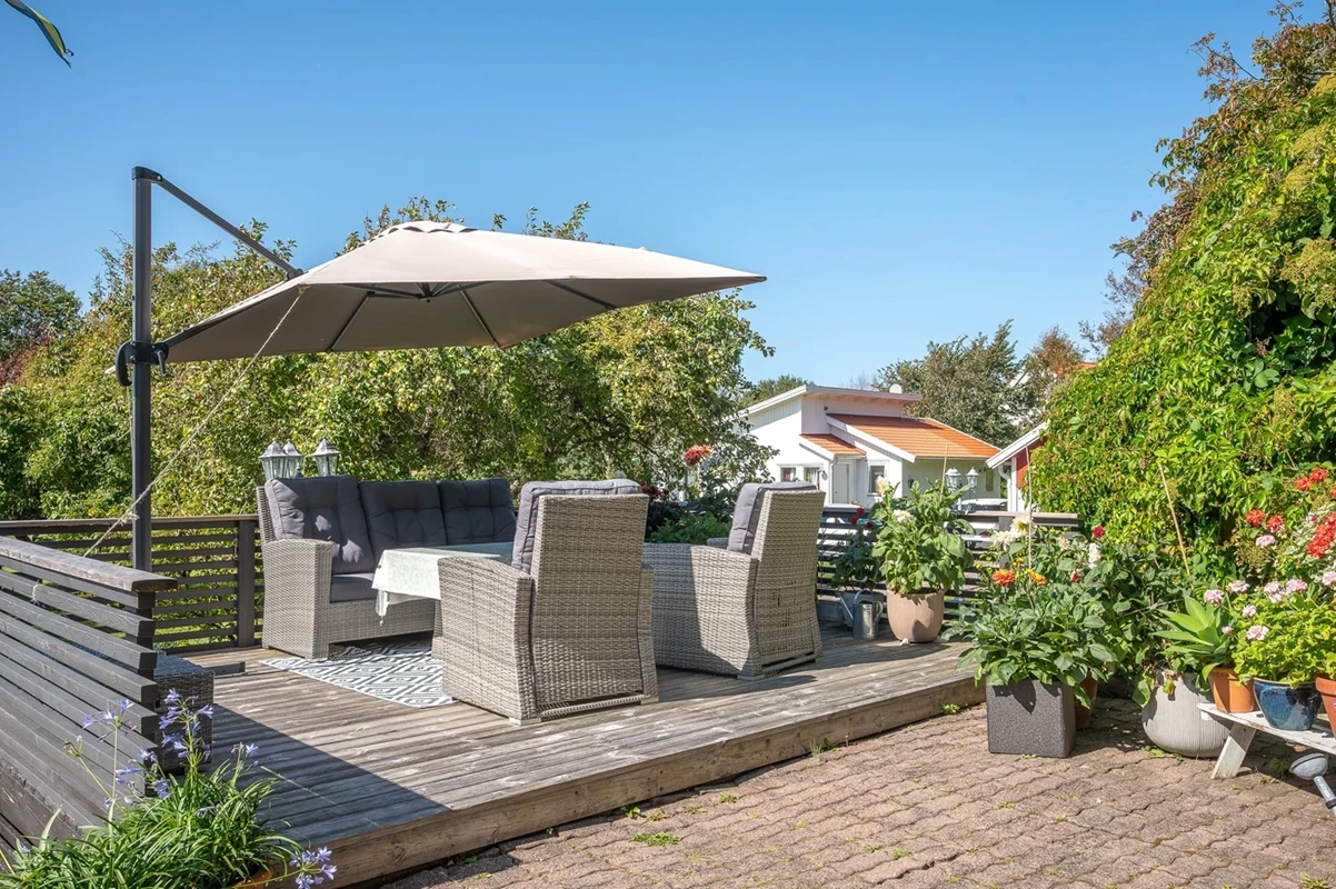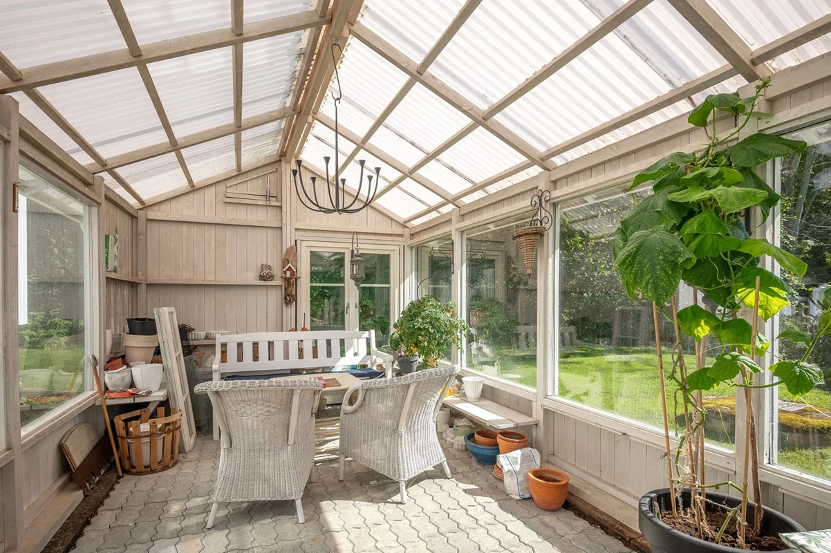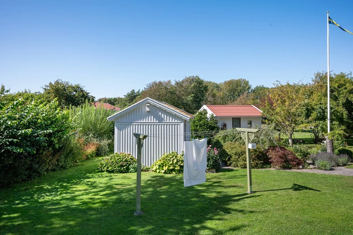Du möts av en trädgård som imponerar på de flesta. Här har kärlek och kreativitet skapat en skön oas med grusade gångar, schiffer och granit och inte minst mängder med lättskötta rabatter med gammeldags perenner. Detta kompletterat med ett växthus och de två gästhusen som ramar in gör att man får känslan av en egen liten ”Trädgårdsförening”. Växthuset är inte bara för odlingar utan nyttjas som ett uterum och möbleras därefter. De båda gästhusens ger gott om plats för gäster, även vintertid då den största av dem är isolerad och har indragen.